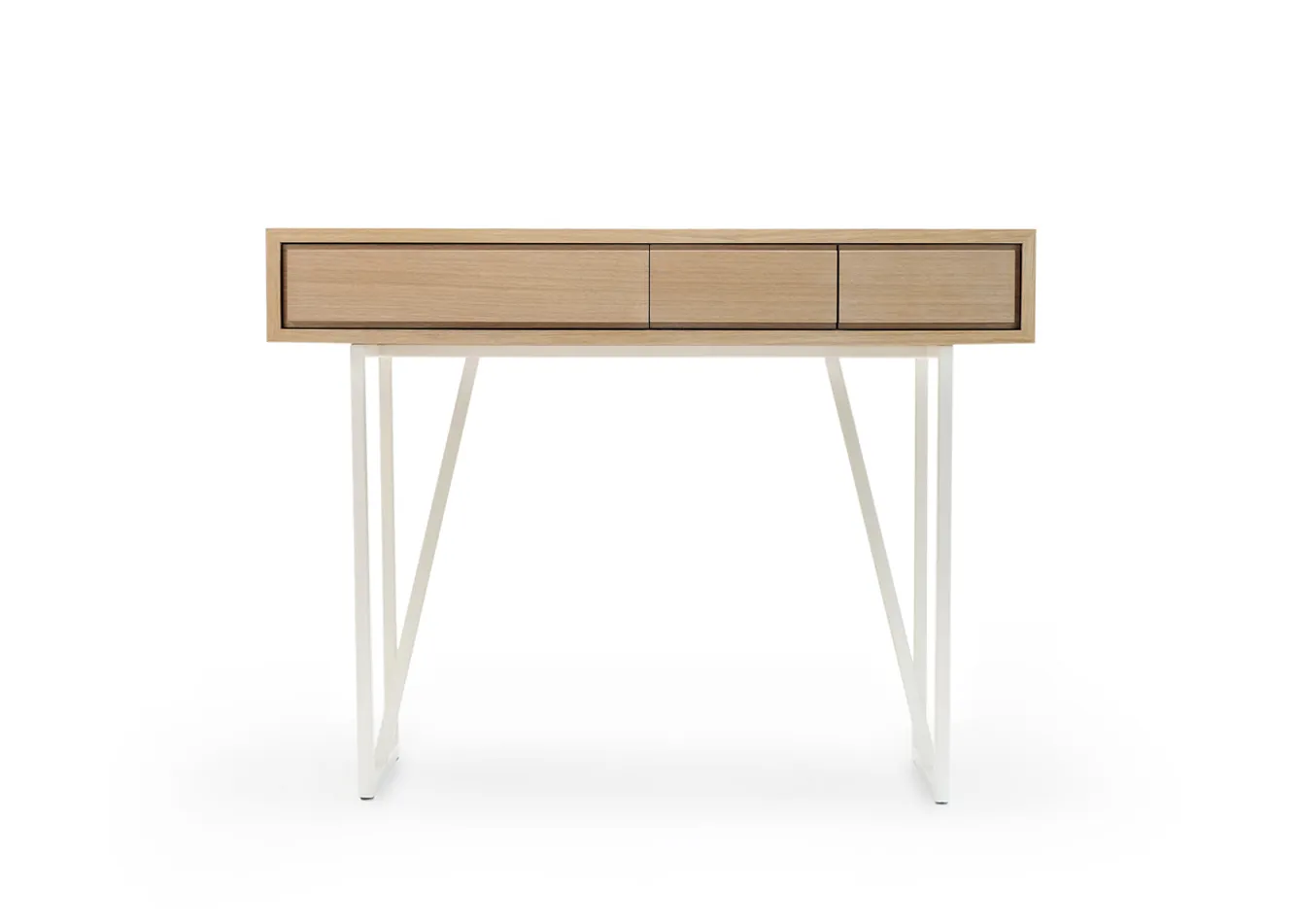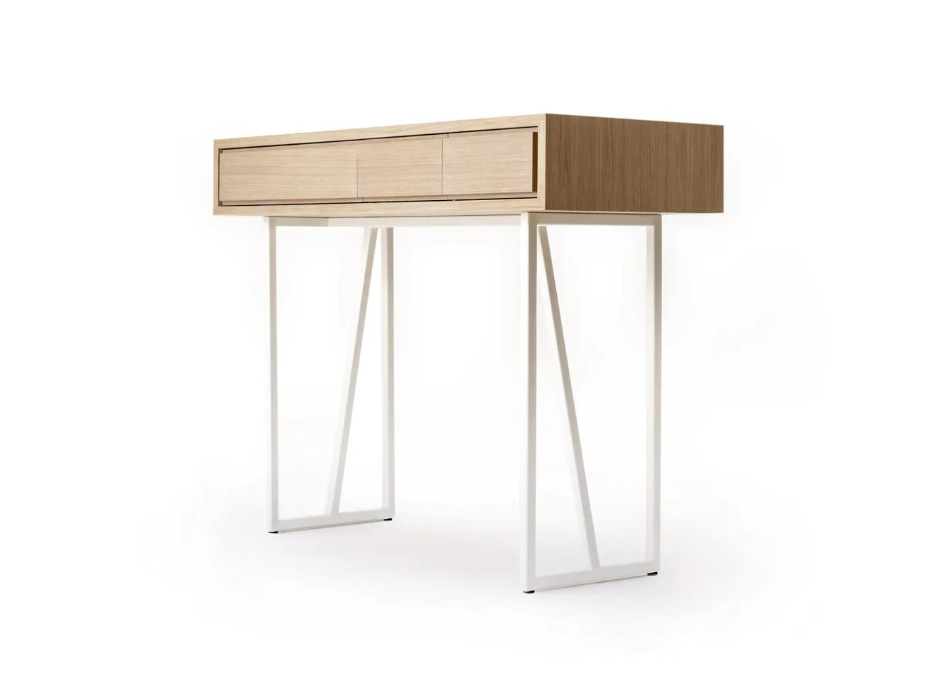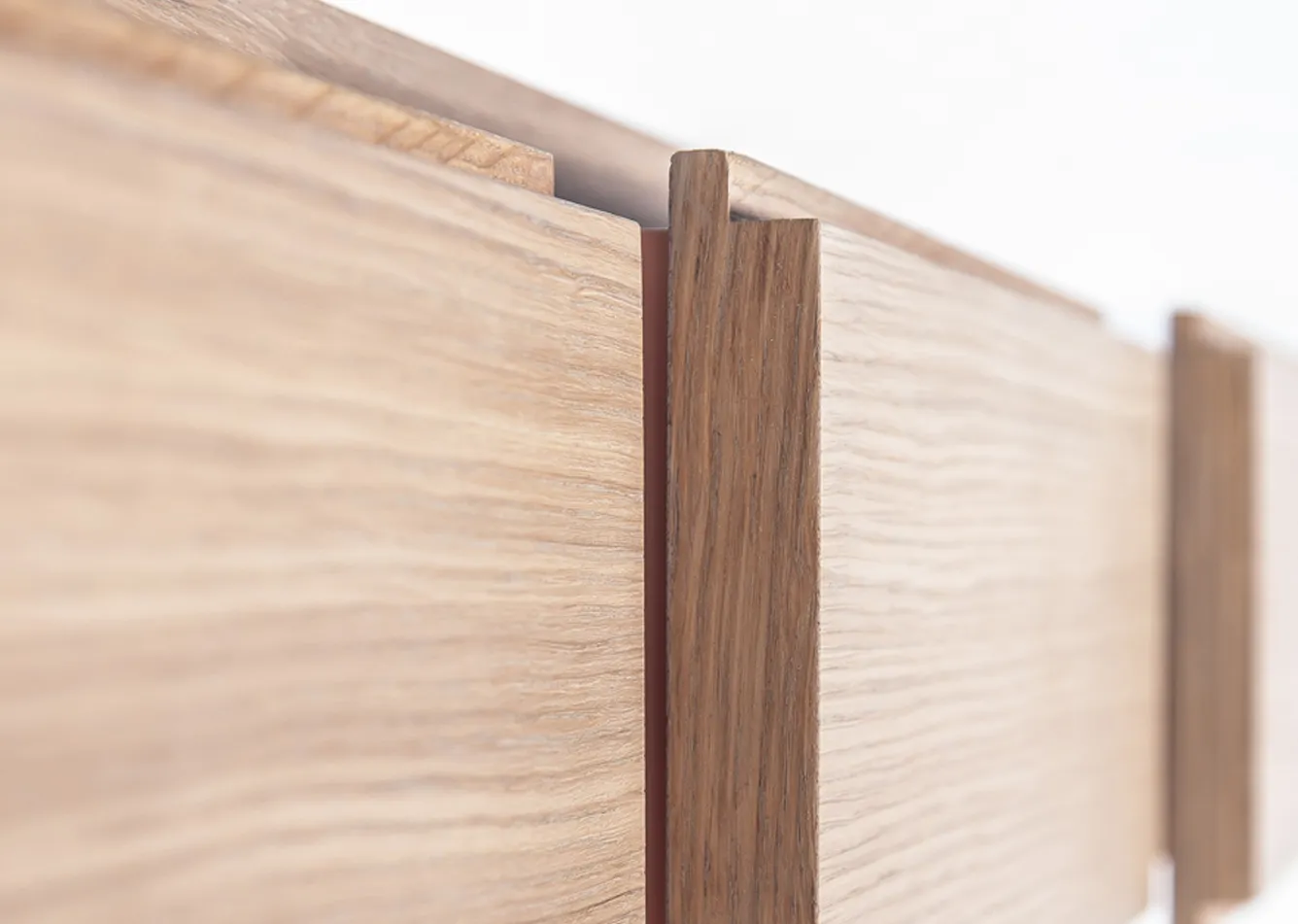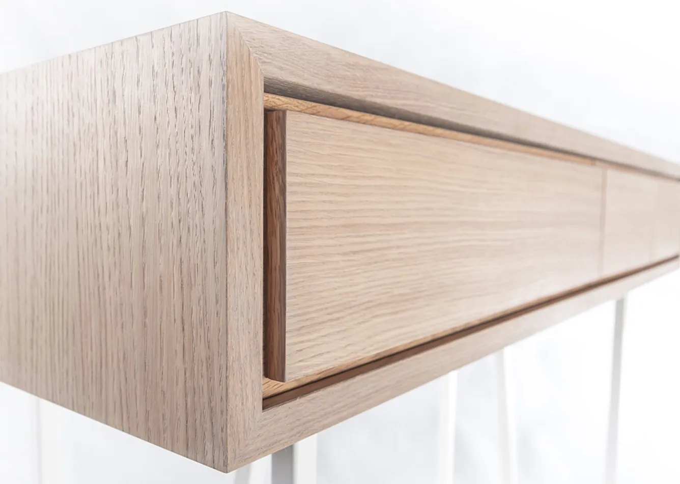 Precyzyjne wykonanie i najwyższej jakości materiały dodają temu połączeniu elegancji. Prosta drewniana forma sprawia wrażenie jakby unosiła się nad ziemią. Odsłania się powoli. Swoje intrygujące wnętrze pokazuje dopiero za asymetrycznymi frontami dębowych szuflad.